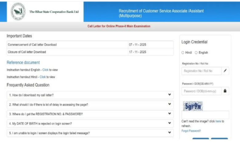 बिहार राज्य सहकारी बैंक लिमिटेड (BSCB) की ओर से कस्टमर सर्विस एसोसिएट और असिस्टेंट की मुख्य परीक्षा के लिए एडमिट कार्ड जारी कर दिए गए हैं। बीएससीबी की ओर से यह परीक्षा बिहार राज्य के विभिन्न परीक्षा केंद्रों में 17 नवंबर, 2025 को आयोजित कराई जाएगी। जो उम्मीदवार प्रारंभिक परीक्षा में सफल हुए थे, वे मुख्य परीक्षा का एडमिट कार्ड अब आधिकारिक वेबसाइट biharscb.co.in पर जाकर डाउनलोड कर सकते हैं। एडमिट कार्ड डाउनलोड करने के लिए उम्मीदवारों को रजिस्ट्रेशन नबंर, पासवर्ड और कैप्चा कोड को दर्ज करना होगा।