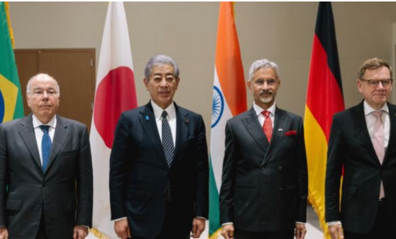 भारत, ब्राजील, जर्मनी और जापान के विदेश मंत्रियों ने संयुक्त राष्ट्र महासभा (यूएनजीए) के 80वें सत्र के दौरान मुलाकात कर संयुक्त राष्ट्र सुरक्षा परिषद (यूएनएससी) में सुधार की तत्काल जरूरत पर जोर दिया। इस बैठक में भारत के विदेश मंत्री डॉ. एस. जयशंकर, ब्राजील के विदेश मंत्री माउरो विएरा, जर्मनी के फेडरल विदेश मंत्री डॉ. जोहान वेडफुल और जापान के विदेश मंत्री इवाया ताकेशी शामिल हुए।