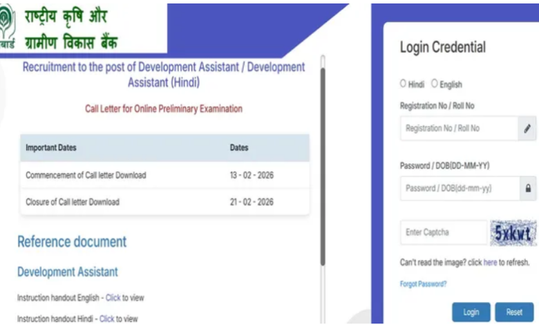 नाबार्ड की ओर से डेवलपमेंट असिस्टेंट प्रीलिम एग्जाम का आयोजन निर्धारित परीक्षा केंद्रों पर 21 फरवरी 2026 को करवाया जायेगा। एग्जाम के लिए एडमिट कार्ड का लिंक 21 फरवरी तक एक्टिवेट रहेगा। ध्यान रखें कि एग्जाम में शामिल होने के लिए उम्मीदवार प्रवेश पत्र अनिवार्य रूप से डाउनलोड कर लें।