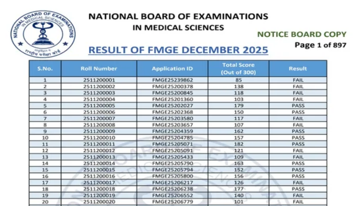 एनबीईएमएस की ओर से (FMGE Result 2026) जारी कर दिया गया है। उम्मीदवार ऑफिशियल वेबसाइट पर जाकर अपना रिजल्ट देख व डाउनलोड कर सकते हैं। इस परीक्षा में कुल 23.77 फीसदी अभ्यर्थी ही सफल हुए हैं।