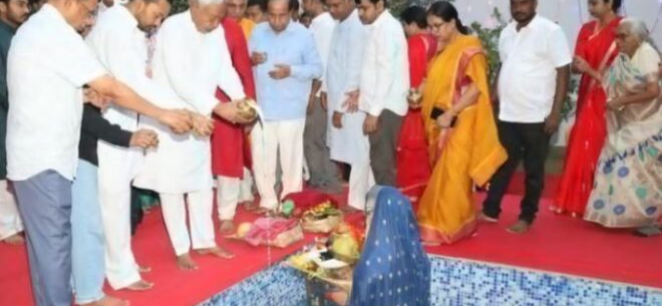 सीएम नीतीश कुमार ने दिया भगवान भास्कर को अर्घ्य