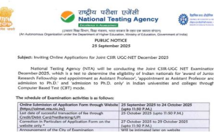 एनटीए की ओर से सीएसआआीआर-यूजीसी नेट दिसंबर परीक्षा का आयोजन 18 दिसंबर, 2025 को किया जाएगा। परीक्षा दो पाली में आयोजित कराई जाएगी। पहली पाली सुबह 9 बजे से लेकर दोपहर 12 बजे तक और दूसरी पाली दोपहर 3 बजे से लेकर शाम 6 बजे तक संचालित की जाएगी। यह परीक्षा कुल पांच पेपर के लिए आयोजित कराई जाएगी