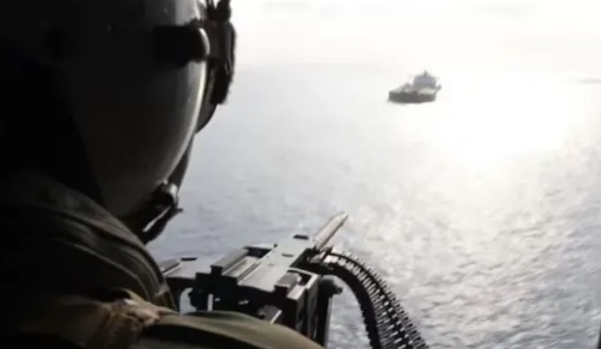 CENTCOM के वीडियो में एक अमेरिकी सैनिक को एक जहाज की ओर भारी कैलिबर वाली मशीनगन ताने हुए देखा जा सकता है, जबकि रेडियो पर चेतावनी देते हुए भी सुना जा सकता है।